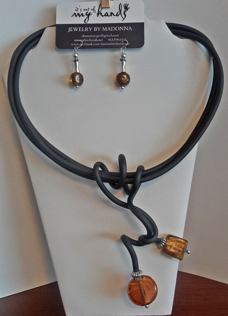 I finished a couple more wire women to replace the 3 I sold this week. And while straightening up my art room, found a roll of a rubber tubing, so decided to see what jewelry could I could create. It is very light weight and fun to stuff with wire & design pendants. Check back soon: I have ideas to incorporate some black and white beads with it for summer necklaces…