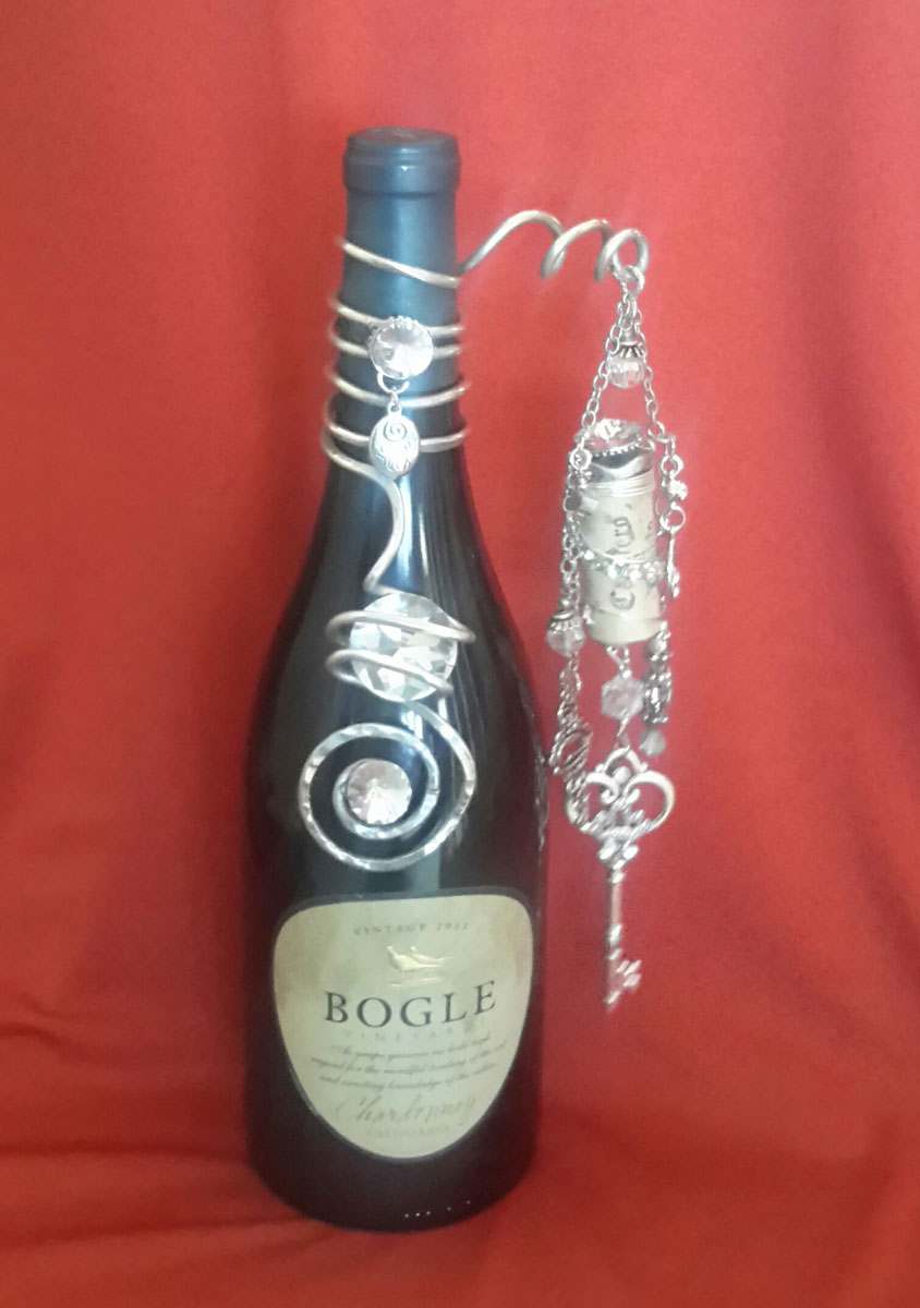 I seem to have collected an abundance of wine corks over the years, so decided to make something fun out of them. This wire swirl and hanging cork adornment can be slipped off and on any bottle. This one is all silver & bling, but more to come. Wonderful little one-of-a- kind addition to a bottle of wine for hostess gift, too.